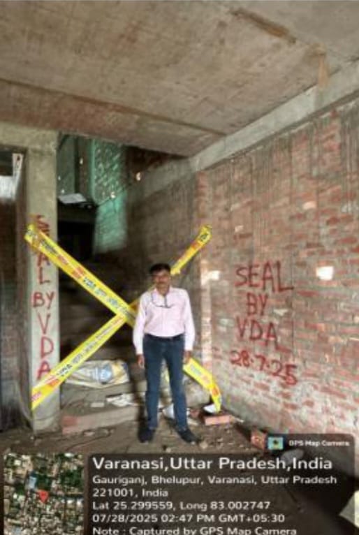 ● वार्ड-भेलूपुर, के अंतर्गत मोहम्मद मूसा द्वारा, आराजी सं0-488 व 489, भवन सं0-बी-12/13, गौरीगंज, थाना- लंका में स्वीकृत मानचित्र के विपरीत लगभग 35 X 50 वर्गफीट के भूखण्ड क्षेत्रफल में सेटबैक को कवर करते हुये पीलर खडे़ कर बेसमेंट का निर्माण किए जा रहे अवैध निर्माण को उ०प्र० नगर नियोजन एवं विकास अधिनियम 1973 की सुसंगत धारा-27, 28(1), 28 (ii) के अन्तर्गत पूर्व में नोटिस की कार्यवाही की गयी थी । परन्तु निर्माणकर्ता द्वारा वर्तमान में बी+जी+4 तलों का निर्माण पूर्ण कर चोरी-छिपे तथा फिनिशिंग आदि का निर्माण कार्य किया जा रहा था ।
